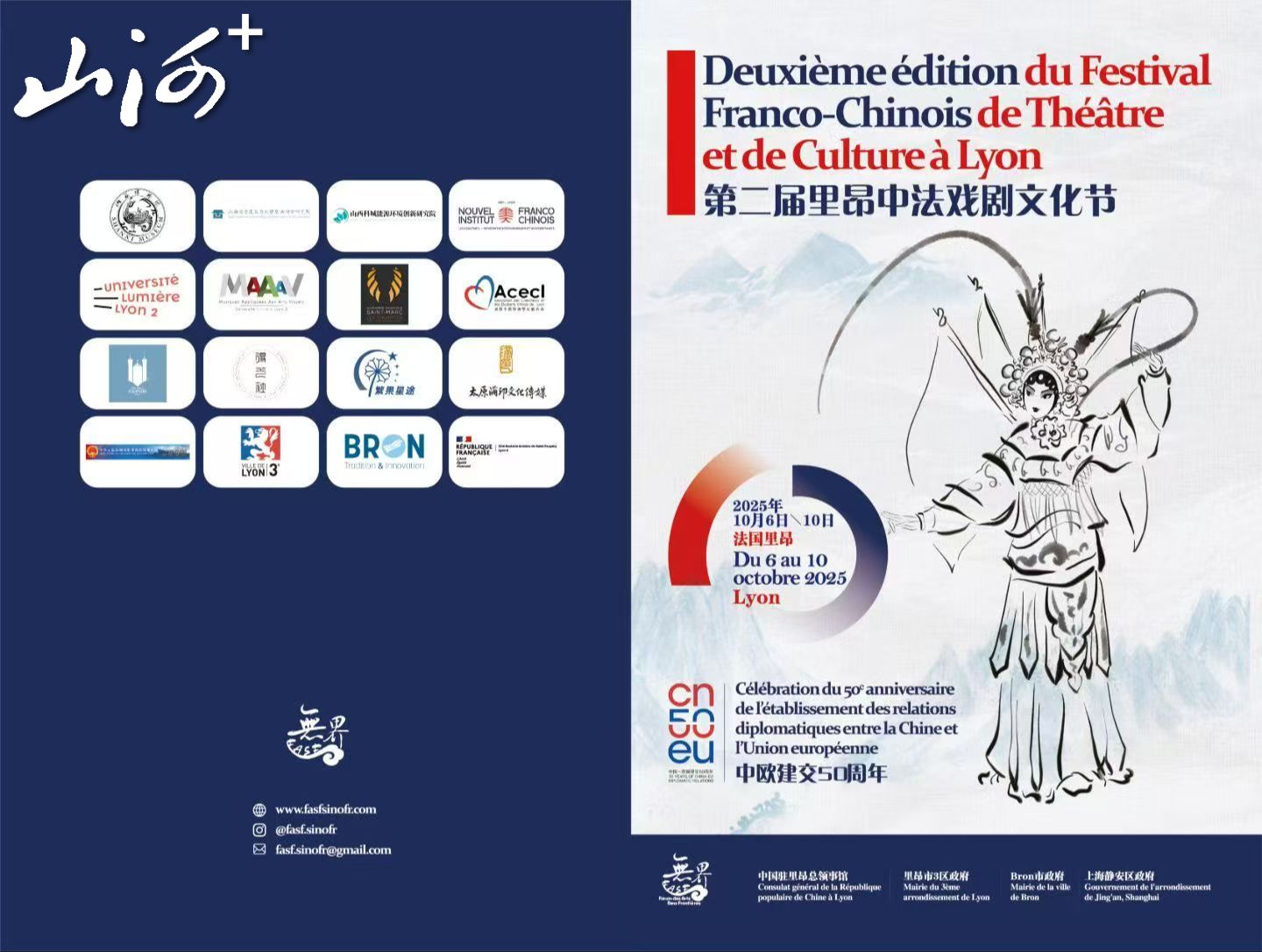 2025年10月6日至10日,第二届里昂中法戏剧文化节(Deuxième édition du Festival Franco-Chinois de Théâtre et de Culture à Lyon)在法国里昂及布龙成功举办。本届文化节以“庆祝中欧建交50周年·物质与非物质文化遗产的跨界交流”为核心,由法国无界艺术论坛(Forum des Arts Sans Frontières)主办,在中国驻里昂总领事馆、里昂市第三区政府、布龙市政府及上海静安区政府的支持下,汇聚中法艺术家、学者与青年学生,打造了一场跨越文化与时代的艺术盛宴。