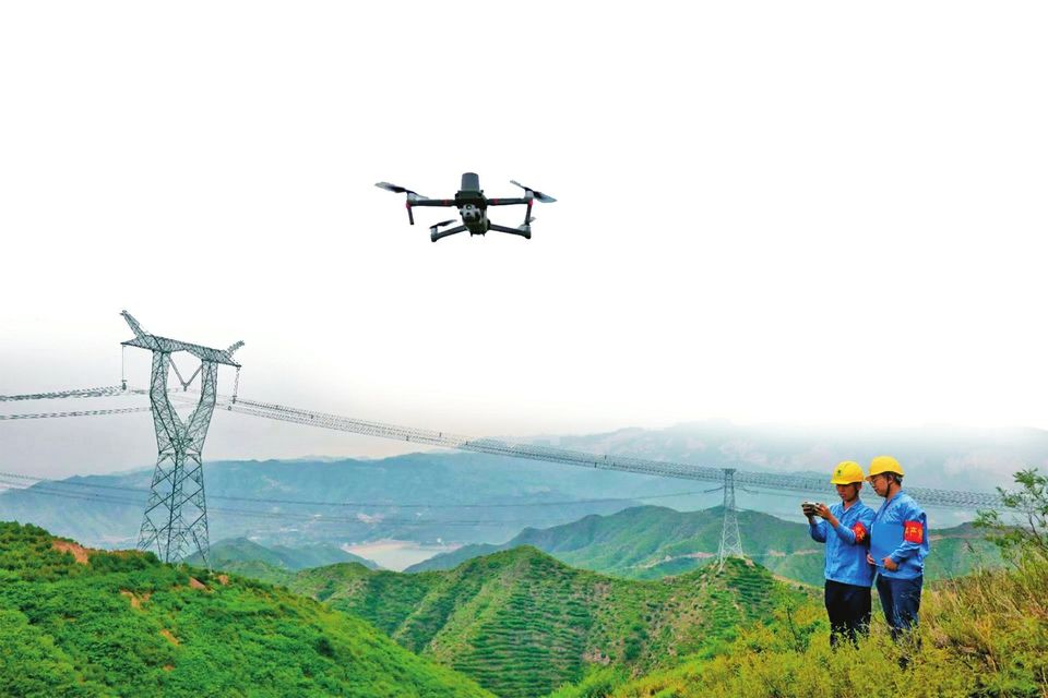 工作人员正在用无人机检查山阴县鄂岳Ⅰ、Ⅱ线1000千伏特高压输电线路。 张涛摄