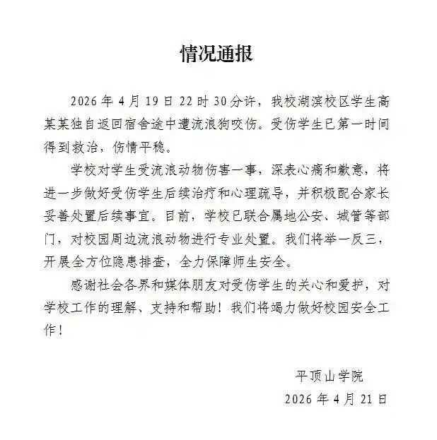据平顶山学院4月21日晚发布的官方情况通报,学校对此次事件“深感痛心并诚恳致歉”。通报称,受伤学生已在第一时间接受规范医疗处置,目前身体状况稳定。学校将全力做好其后续治疗及心理疏导工作。同时,已联合公安、城管等相关部门,对校园周边流浪动物进行集中、专业处置,并举一反三,全面排查校园安全隐患,切实保障师生人身安全。