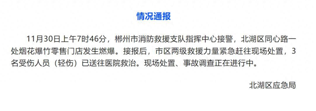 山西晚报·山河+讯 11月30日,山西晚报·山河+记者注意到,多位网友发视频称,湖南郴州北湖区一处烟花爆竹零售门店发生燃爆事故。据北湖区应急管理局通报,事故造成3人受轻伤,无生命危险。