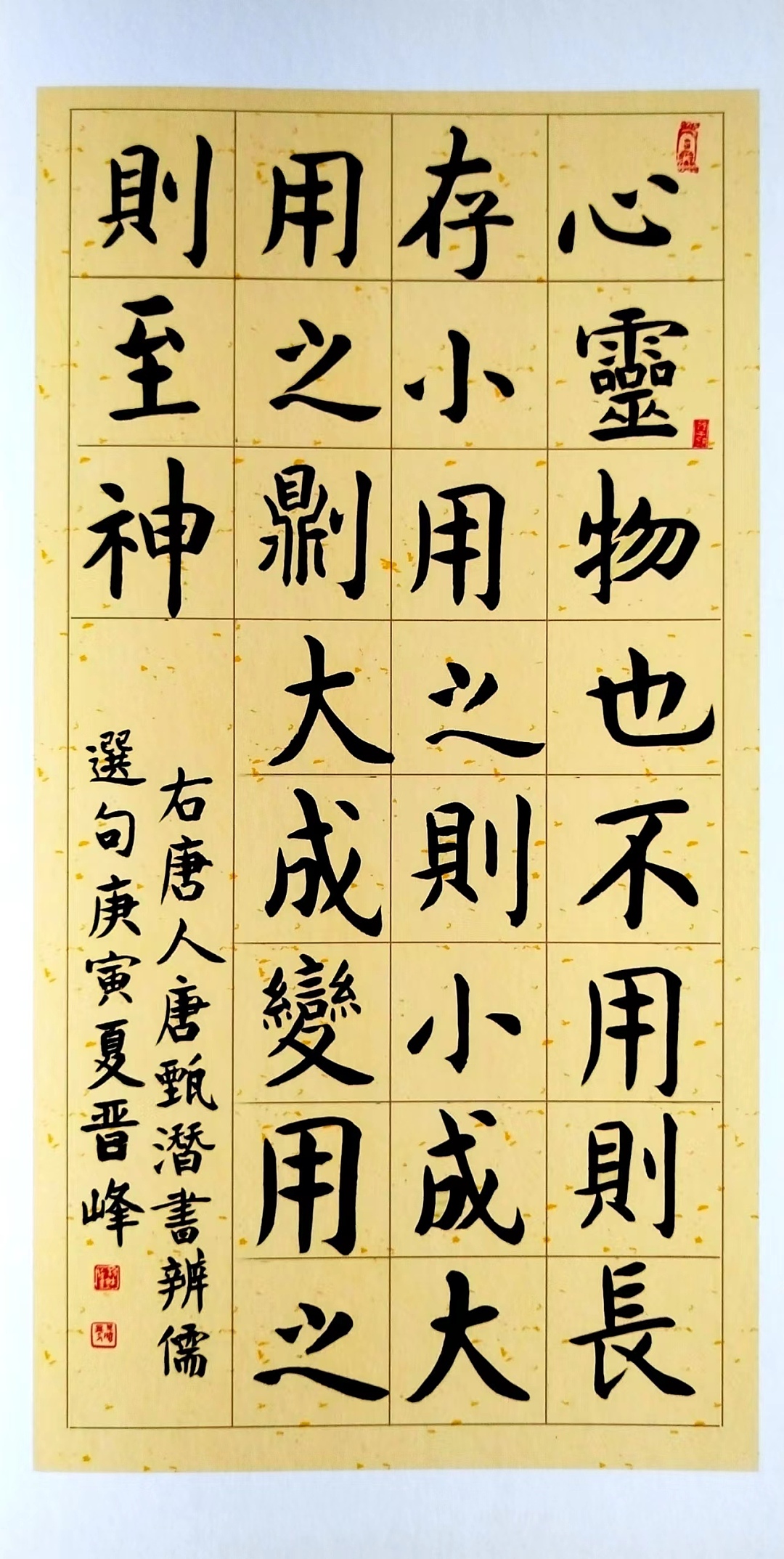 杨晋峰,1959年9月出生,山西榆社人,中共党员,中国民间文艺家协会会员,山西省美术家协会会员,山西省书法家协会会员,山西省作家协会会员,山西诗词学会会员,山西大众书画院会员,晋中市书法、美术家协会会员,晋中大众书画院、晋中乡土艺术协会常务理事,榆社县美术家协会主席等。书画作品多次参加全国、省、市展并多次获奖!入编十多部典集丛书。由《书法百家》编辑出版《杨晋峰书法作品集》,获《盛世中华》第二届全国时代文艺家称号。中央广播电视总台《智慧中国》栏目进行专题采访!