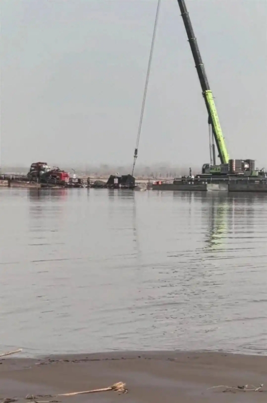 网传视频显示,浮桥位于水面上的中段明显下陷,一辆重型货车停于塌陷处,车头尚在桥面,车尾已沉入水面以下,隐约可见车上货物。现场已有大型吊车等救援设备展开施救作业。