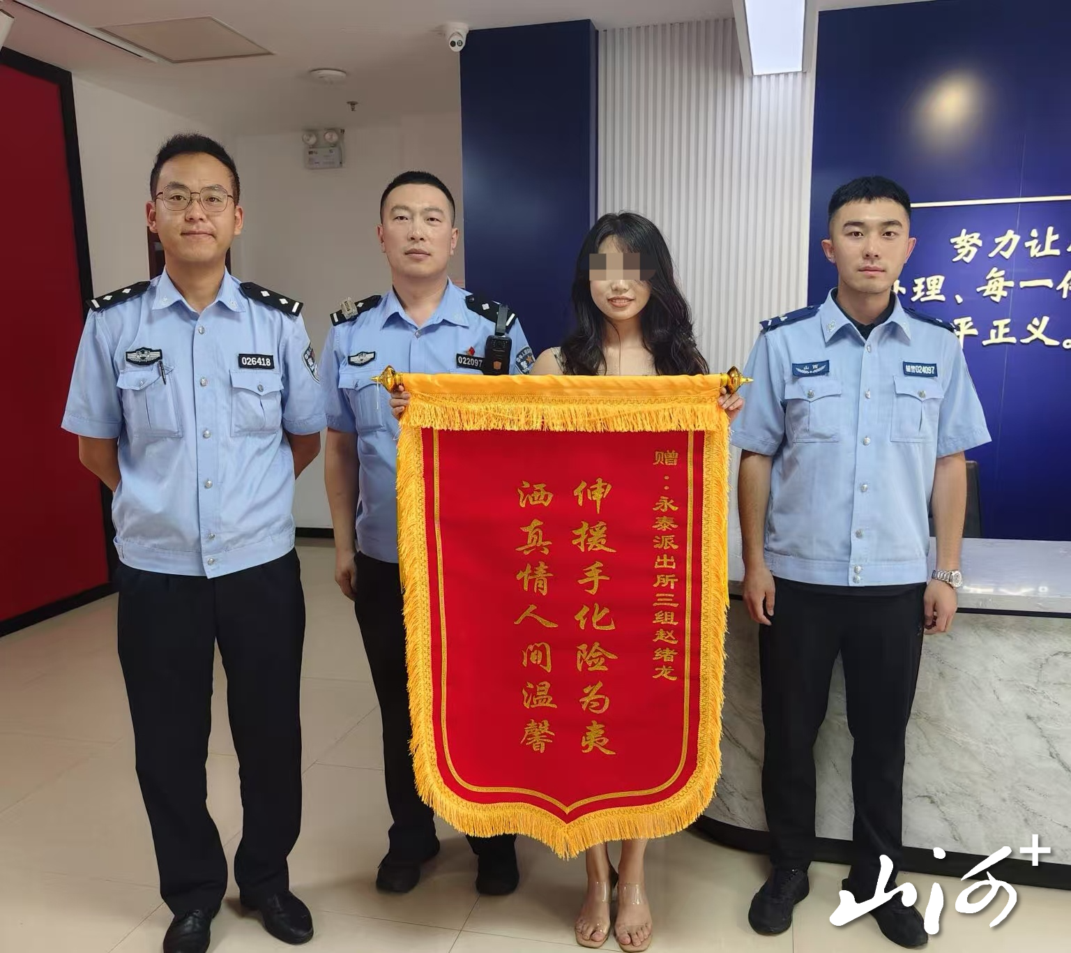 山西晚报·山河+讯 8月13日,一面写有“伸援手化险为夷 洒真情人间温馨”的锦旗被送到了大同市公安局平城分局永泰派出所,鲜红的锦旗与金色的字迹相映,饱含着群众对民警的诚挚谢意,这背后是一段民警不顾危险、勇救坠河宠物犬的暖心故事,相关事迹经网络传播后,更收获了网友的一片点赞。