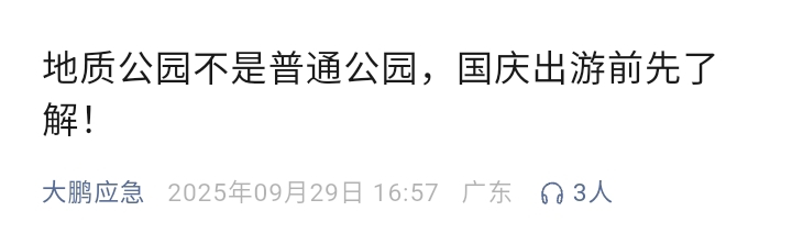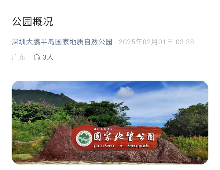 2025年9月29日,大鹏新区应急管理局官方微信公众号发布《地质公园不是普通公园,国庆出游前先了解!》文章,文中提到,和普通的公园可不一样,大鹏半岛国家地质自然公园更像一个“野生”的自然博物馆!路况更“原生态”:很多步道是沿着山脊、海岸自然形成的,不像普通公园那样平整宽阔。有些地方可能陡峭、湿滑,甚至需要手脚并用,一双防滑的户外鞋是必备的。天气说变就变:海边和山区的天气就像娃娃的脸,上一秒晴空万里,下一秒可能就起雾或下雨。一旦能见度降低,很容易迷路。雨天路滑,风险更是大大增加。部分区域是“禁区”:公园里有一些未开放的区域,这些地方通常地质条件更复杂,缺乏安全设施和信号覆盖。千万不要因为好奇或者想寻找“独家机位”而冒险进入,那真的是在和自己的安全开玩笑。