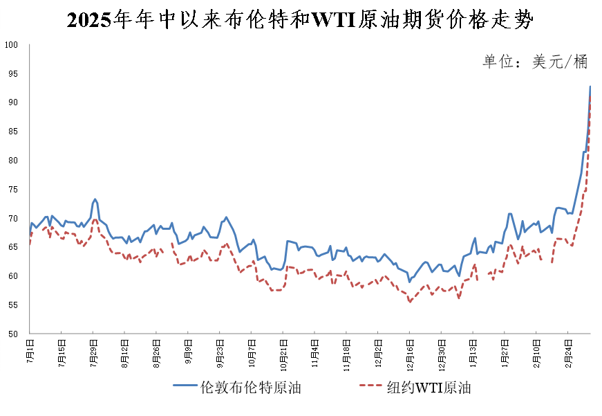 周期末期,伊朗发动大规模导弹攻势,并宣称摧毁美国部署在海湾国家的雷达系统,战火从海上运输线蔓延至陆上军事目标,局势进一步扩大。受此影响,国际油价在短时间内接连突破每桶80美元、90美元关口,截至3月6日,伦敦布伦特、纽约WTI原油期货价格收盘分别为每桶93美元和91美元。3月9日开盘,两市油价突破每桶100美元。