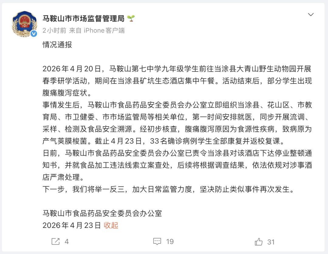 据马鞍山市食品药品安全委员会办公室4月23日发布的情况通报,截至当日,33名确诊学生均已康复并返校复课。