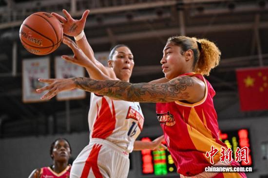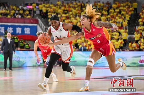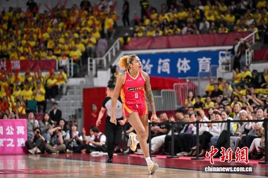 4月17日,山西队球员奥斯汀在比赛中庆祝得分。当日,在太原举行的2025-2026赛季中国女子篮球联赛(WCBA)总决赛第2轮比赛中,山西竹叶青酒队主场以72比70战胜四川蜀道远达队,将总比分扳成1:1。