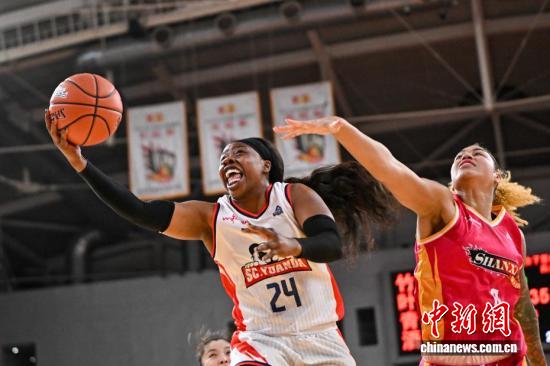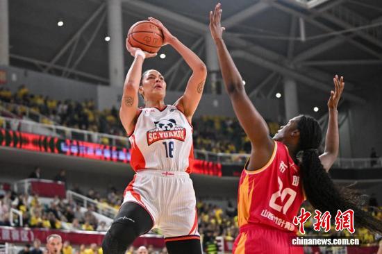四川队球员坎贝奇(白衣)在比赛中投篮。