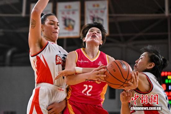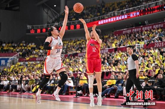 山西队球员陈玉婕(红衣)在比赛中投篮。