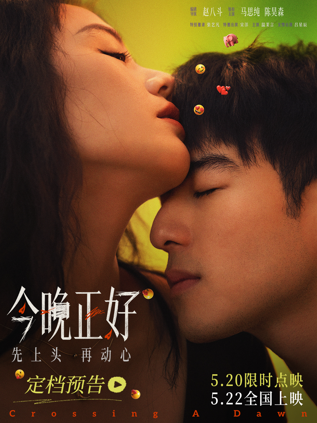由赵八斗编剧、执导的都市爱情电影《今晚正好》28日官宣将于5月22日全国上映,5月20日全国限时点映,影片同步释出定档预告和定档海报。马思纯、陈昊森大银幕首度合作,打破常规,大胆呈现成人世界里“不谈永远,只谈今晚”的另类浪漫。预告将镜头对准北京深夜的街头巷尾,一场“见色起意”的相遇,一段仅限今晚的关系,在欲望与真心的暧昧拉扯间,探寻最美妙的情感边界。而定档海报,更以充满春日悸动感的配色搭配极具呼吸感的特写,具象化这对“姐狗CP”间呼之欲出的化学反应。