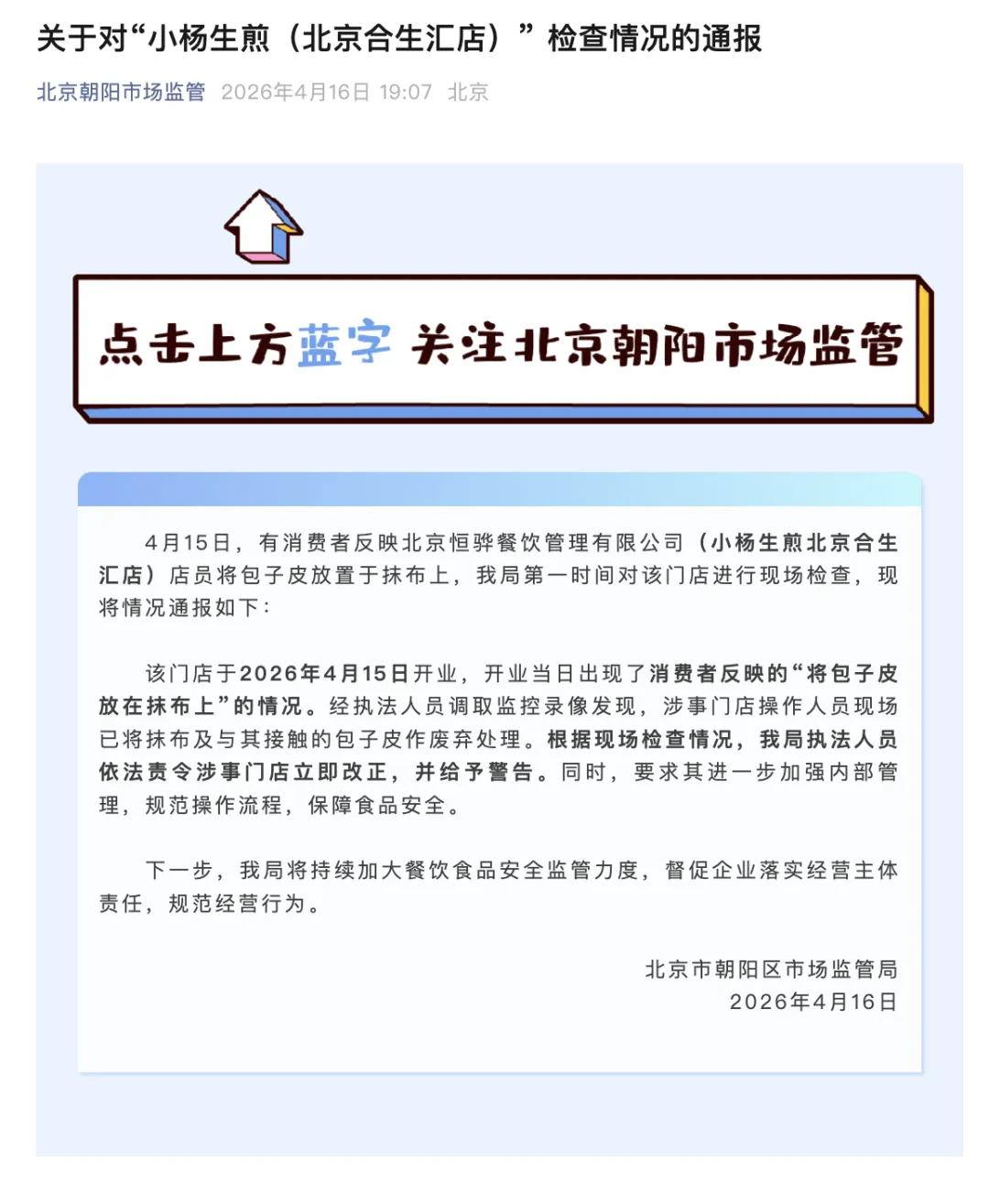 4月17日,记者私信发帖人询问具体情况时,该网友未予回复。随后,记者联系到北京市朝阳区市场监督管理局,一位工作人员表示,针对消费者反映的北京恒骅餐饮管理有限公司(小杨生煎北京合生汇店)店员将包子皮放置于抹布上的情况,该局第一时间对该门店进行了现场检查,具体情况以官方通报为准。