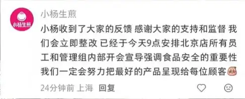 据悉,事发于4月15日。该网友在帖文中表示,当天是门店开业第一天,现场人很多,排队时看到后厨员工正在赶制生煎包,把即将使用的包子皮放在了抹布上。山西晚报·山河+记者注意到,评论区有顾客也晒出了这条抹布。小杨生煎官方账号在帖子下回复称,已收到反馈,会立即整改,并已于4月16日9点安排北京店所有员工和管理组召开内部会议,强调食品安全的重要性。