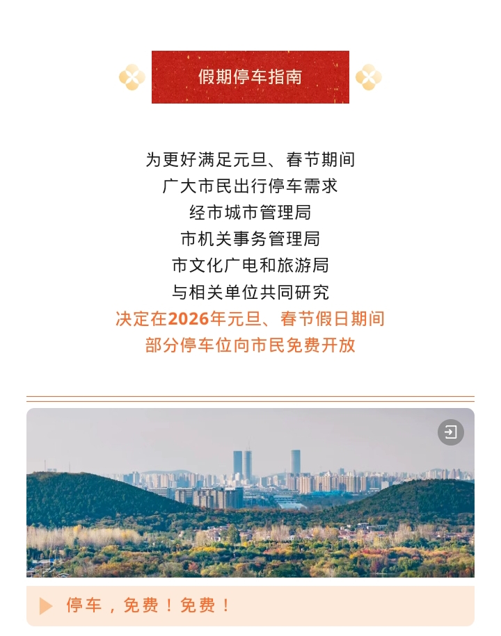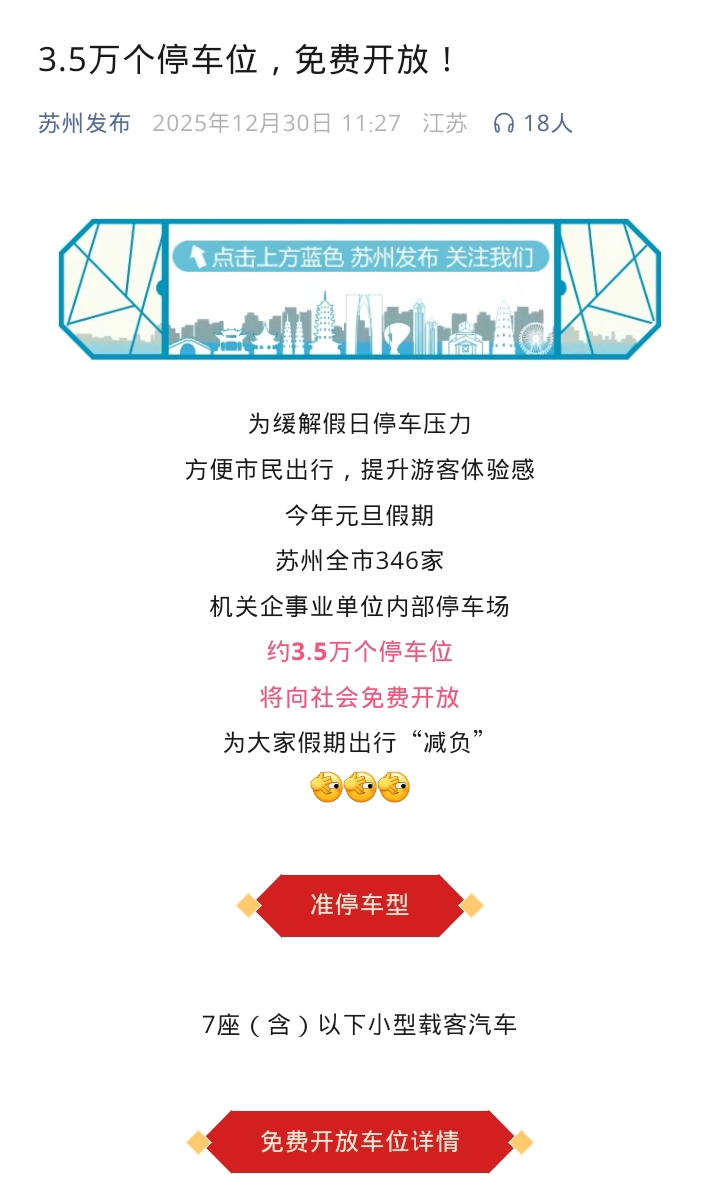 12月30日,“苏州发布”公布,为缓解假日停车压力、优化游客体验,苏州市将在元旦假期开放346家机关企事业单位内部停车场,提供约3.5万个免费车位。开放范围涵盖市级机关、国有企业、驻苏单位、金融机构及各区县、苏州工业园区等。市民游客只需看到单位门口“本停车场‘节假日’对游客车辆免费停放”的标识牌,配合登记车牌号及联系方式,即可入场停车。
