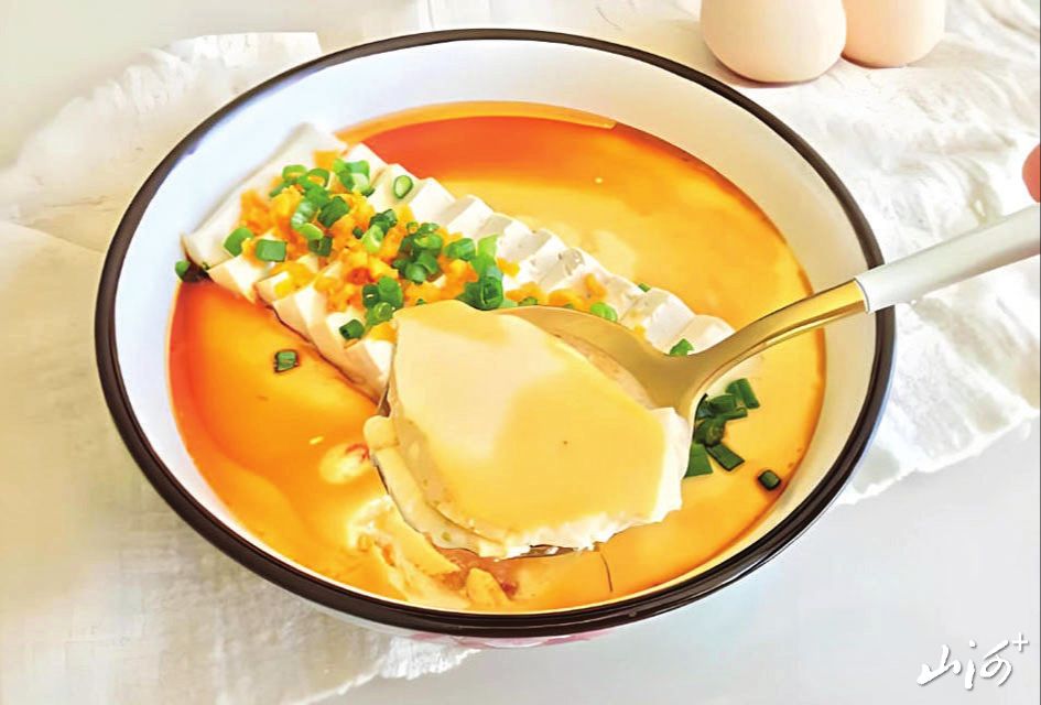 豆腐切成小块,铺在碗底。鸡蛋打散,加入温水和盐搅拌均匀,过滤到豆腐上。盖上保鲜膜,用牙签扎几个小孔,上锅蒸10分钟。出锅后淋上生抽和香油,撒上葱花即可。