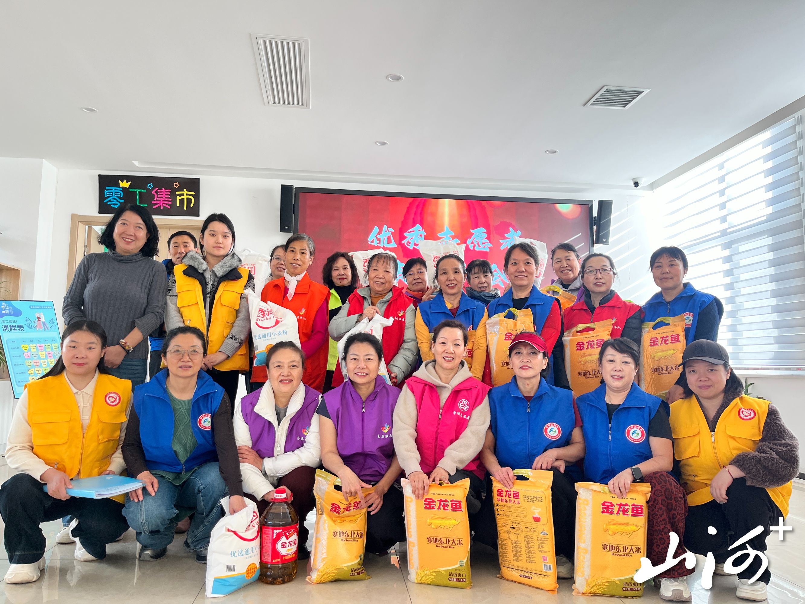 活动现场,志愿者身着服务马甲,有序排队兑换积分礼品。大屏幕上“优秀志愿者表彰大会”与“柏林银辉志愿者积分兑换”的主题背景交相辉映,桌上整齐摆放着大米、面粉、食用油等生活物资,这些都是志愿者用服务时长累积的“暖心成果”。