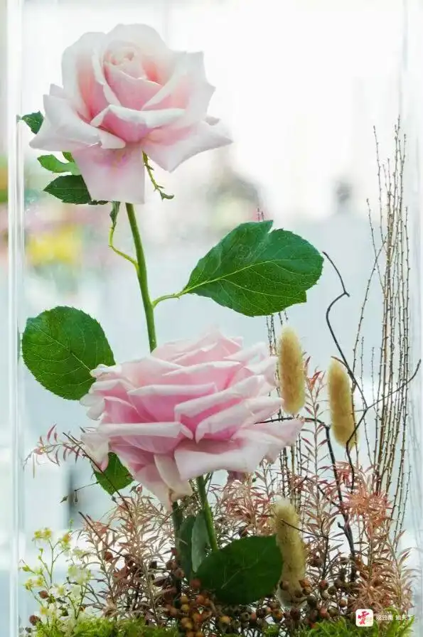 据现场图片显示,这株珍贵的“娇龙月季”被置于定制的透明亚克力护运盒中,由专业花艺团队精心布展。设计师巧妙运用永生植物与具有荒凉质感的干枝造景,辅以火山石象征广袤沙漠,寓意“娇龙”如沙漠中绽放的玫瑰,坚韧而炽热。