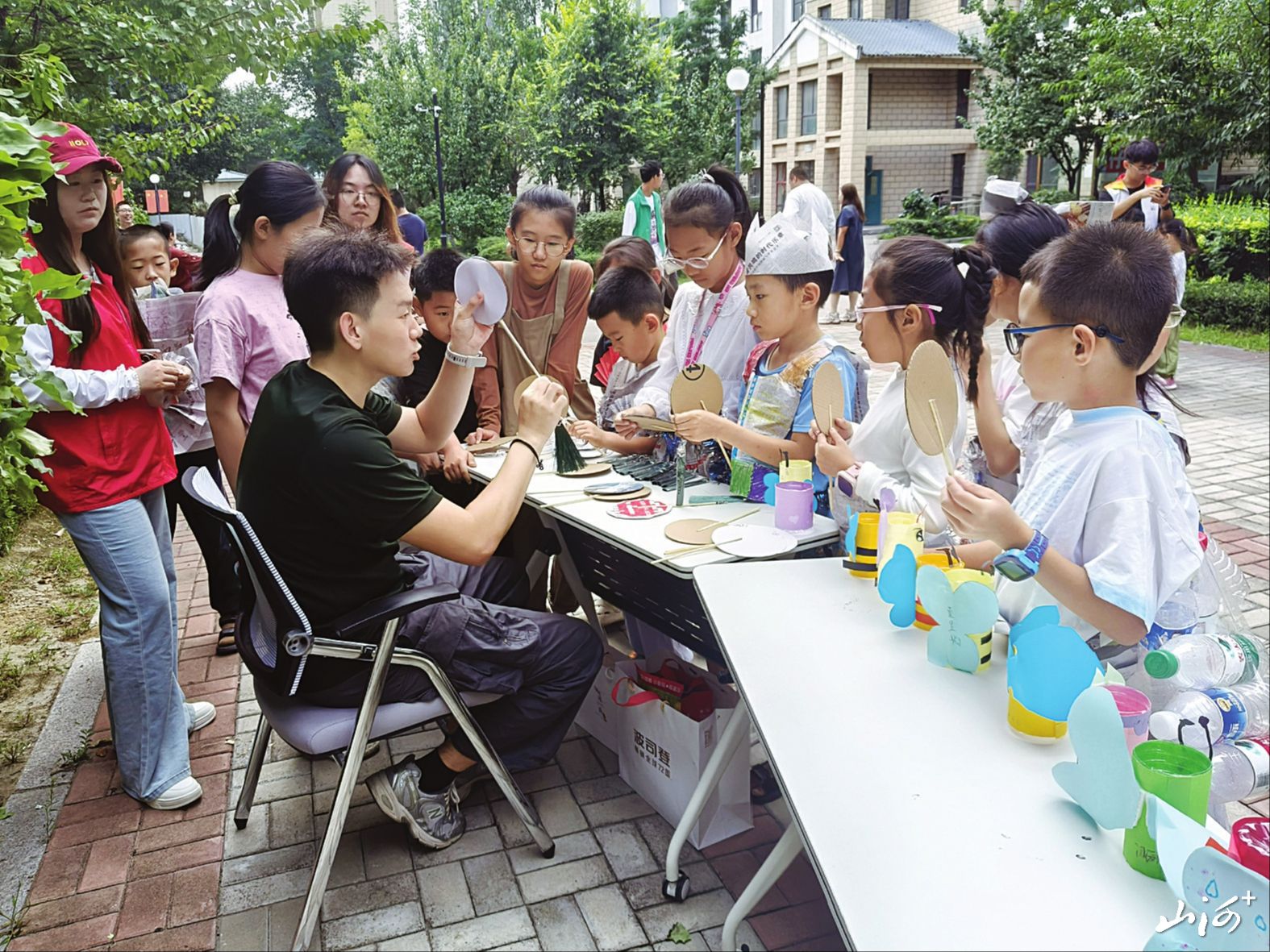 大同市“旧物传情绿色家风”活动中,志愿者为小朋友讲解和演示手工扇制作。