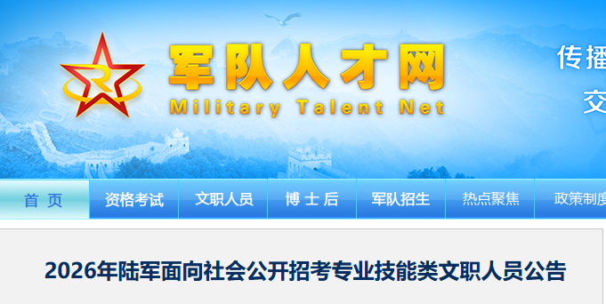2026年陆军面向社会公开招考专业技能类文职人员工作最终解释权归陆军政治工作部所有。