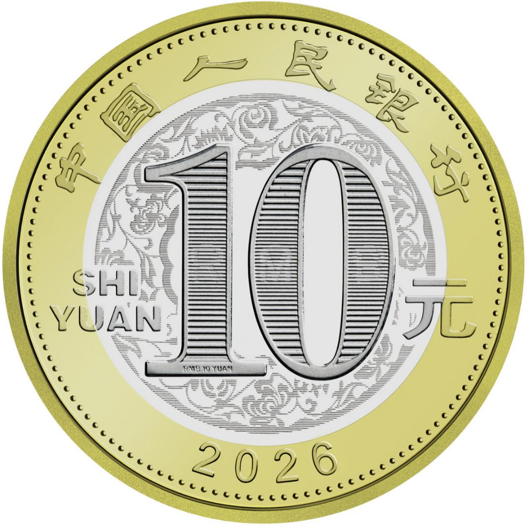 双色铜合金纪念币正面图案为“中国人民银行”“10元”字样,汉语拼音字母“SHIYUAN”及年号“2026”,底纹衬以团花图案。背面图案为中国传统剪纸艺术与装饰年画元素相结合的马形象,衬以花灯和萱草图案,币面左侧刊“丙午”字样。