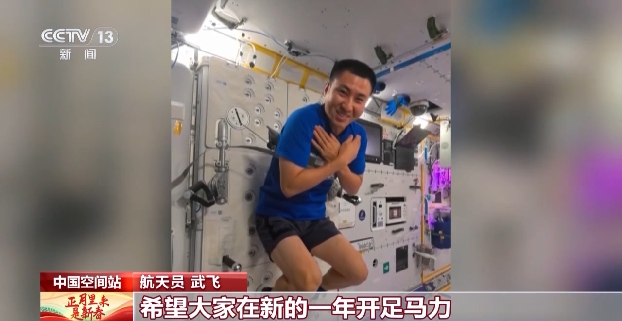 航天员 武飞:现在我利用这个装置进行核心力量锻炼,第一个动作:卷腹。希望大家在新的一年开足马力,为幸福生活奋斗。第二个锻炼动作:推举。预祝大家在新的一年里,把幸福生活推向新高度。