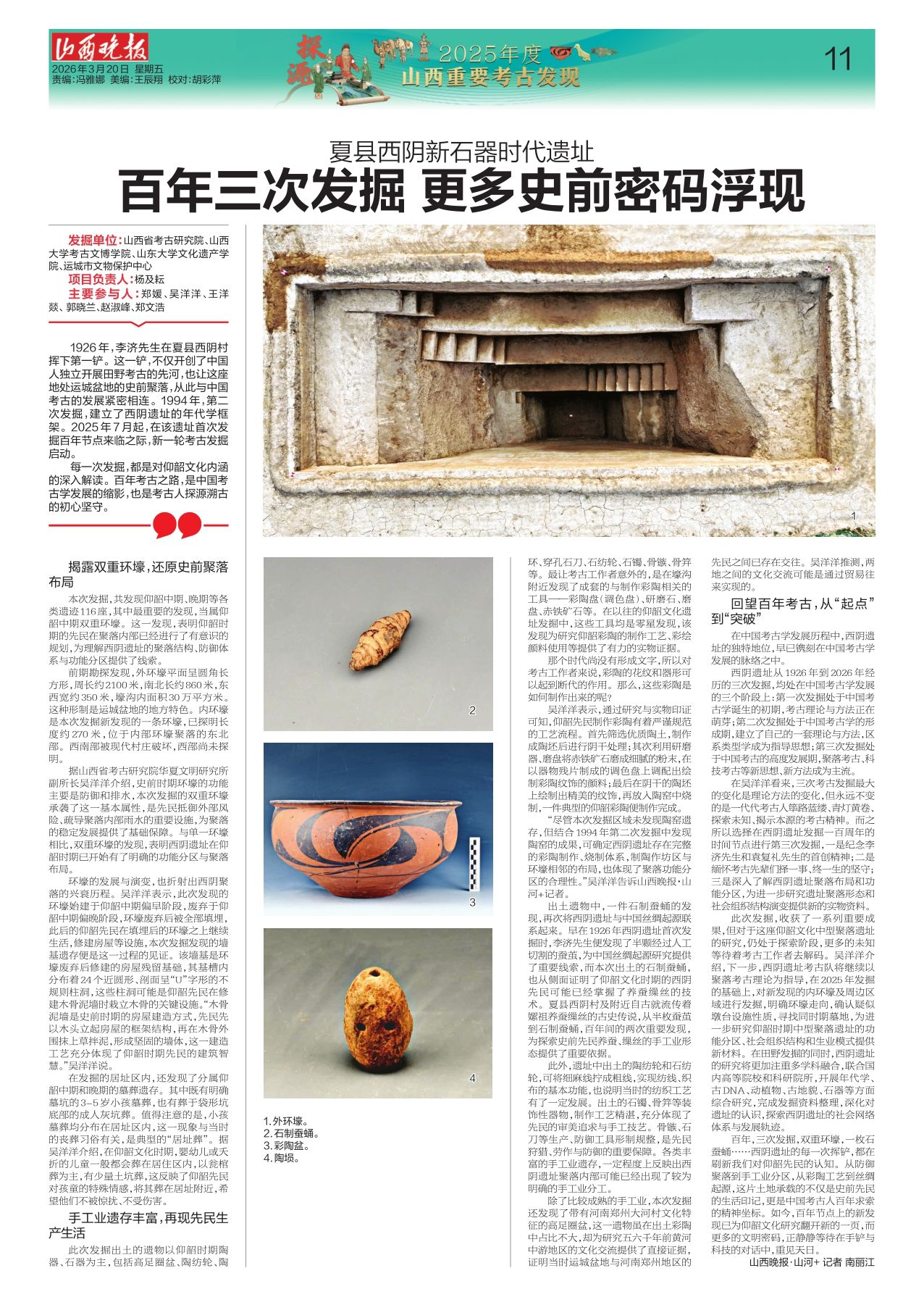 1926年,李济先生在夏县西阴村挥下第一铲。这一铲,不仅开创了中国人独立开展田野考古的先河,也让这座地处运城盆地的史前聚落,从此与中国考古的发展紧密相连。1994年,第二次发掘,建立了西阴遗址的年代学框架。2025年7月起,在该遗址首次发掘百年节点来临之际,新一轮考古发掘启动。
