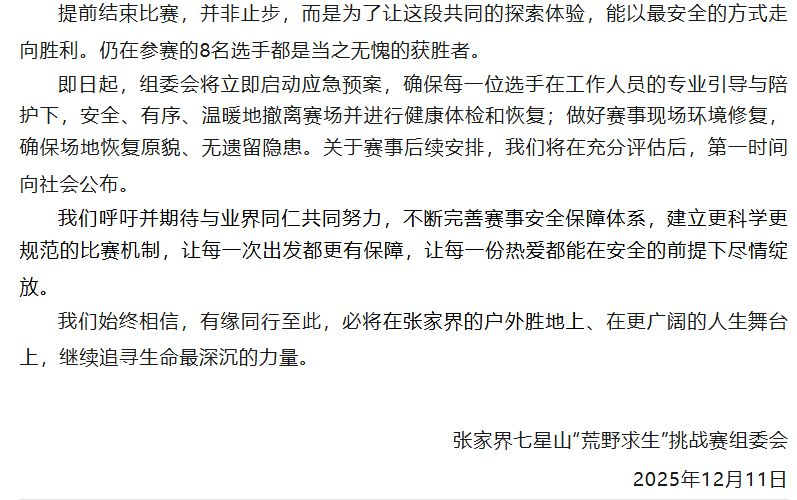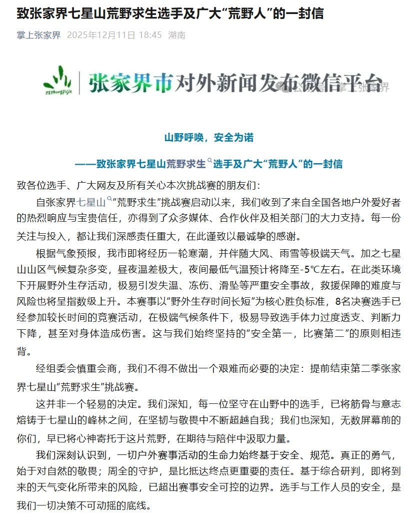 据悉,12月11日,赛事组委会监测到张家界地区即将迎来大风、雨雪天气,山区夜间气温骤降至-5℃左右。在持续40余天的野外生存后,选手普遍体力透支,在极端低温环境下极易发生失温、冻伤及滑坠等安全事故。基于“安全第一”原则,组委会经综合研判,决定提前终止本届赛事。