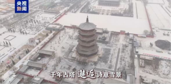 12月12日清晨,山西省朔州市应县木塔景区迎来降雪,这场雪为千年古塔披上圣洁的银装。