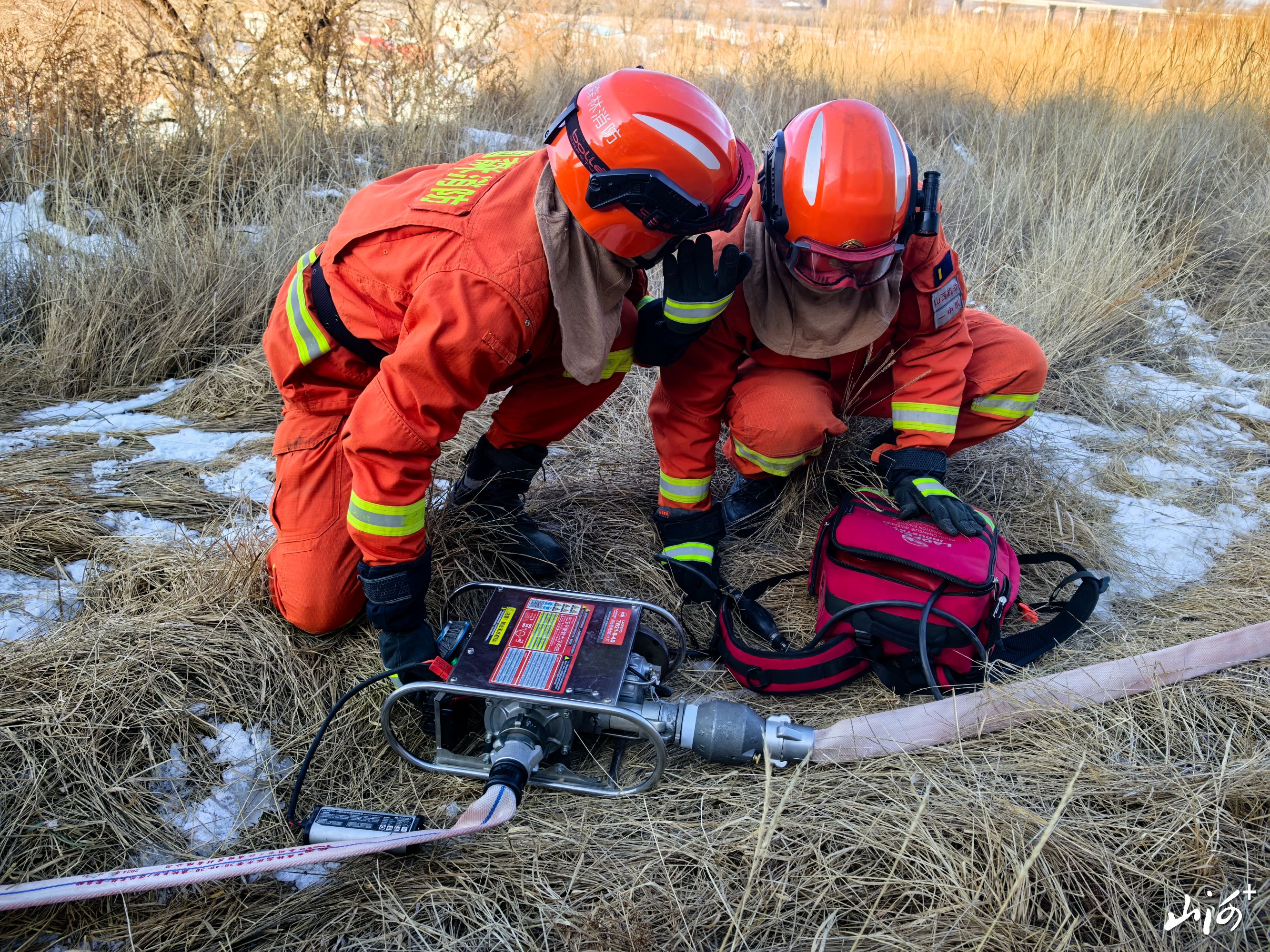 几分钟后,国家消防救援局山西机动队伍驻岢岚分队、岢岚县应急管理局综合救援大队、岢岚县消防救援大队共80余人,携带灭火装备前往火场处置。各小组携带水泵等灭火装备抵达,架设好水泵开展灭火作业。经过紧张作业,火灾被迅速清理,演练结束。
