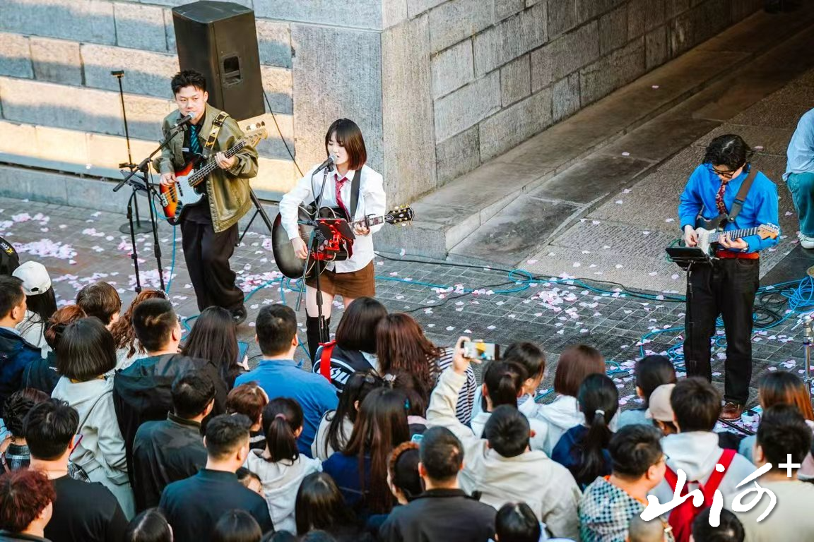 同一时间,“钟楼有好戏之春风唱晚”限定快闪音乐秀也在傍晚点亮街区。民谣歌手在转角处轻声弹唱,暖黄的灯光与暮色交织,为游客带来轻松惬意的夜间体验。太原市民李先生带着父母在钟楼街散步,他说:“以前晚上就是逛逛街、吃点东西,现在有了这些即兴的音乐表演,整个街区的氛围都不一样了,特别有生活气息。”