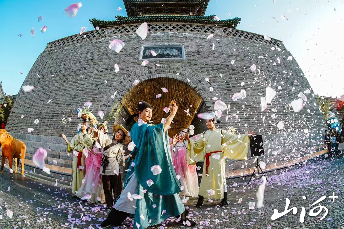 山西晚报·山河+讯 春风拂过青砖黛瓦,杏花瓣瓣飘落于千年古街的石板路上。4月5日,清明假期第二天,太原钟楼街游人如织。下午2时许,伴随着悠扬的牧笛声,一队身着宋制汉服的“杏花仙子”与手持青绿纸伞的舞者从街巷深处踏歌而来,引得路人纷纷驻足拍照——这是钟楼街“游春逐光晋地风物季”系列活动中的一幕。