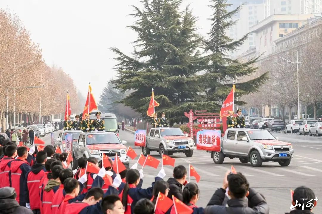 一面战旗,承载一段铁血岁月;一次荣归,激荡一城红色情怀。12月19日,长治黎城这片被热血浸染的太行热土,以最崇高的敬意与最热烈的方式,迎接两位特殊的“英雄儿女”回家——“黄崖洞保卫战英雄团”与“朱德警卫团”战旗。两面承载着不朽功勋与光辉历史的旗帜庄严回归其精神与荣耀诞生的热土。清晨,黎城高速出口红旗招展,“热烈欢迎战旗回家”的横幅分外醒目。当护送战旗的车队缓缓驶出,在此等候的少先队员鼓号队立刻奏响激昂的乐章。在警车与仪仗摩托车的庄严护卫下,覆盖着红色锦缎的战旗,踏上了在全城目光注视中的“回家之路”。车队巡行经过县城主干道,街道两旁自发聚集的市民群众肃立注目,眼神中满含敬仰与激动。