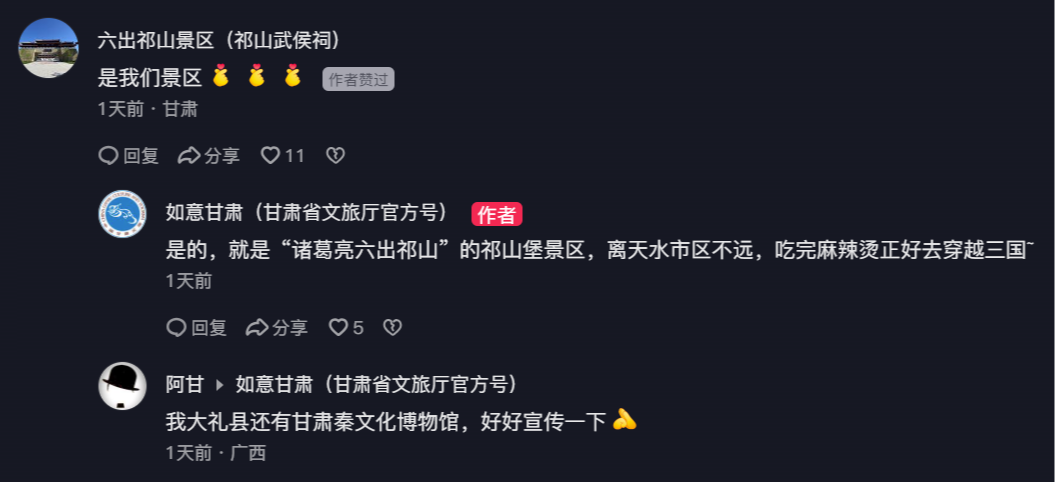 最出圈的是甘肃省文旅厅官方账号“如意甘肃”发布的:“吃完天水麻辣烫,打车去诸葛亮摆空城计的地方。”网友在评论区纷纷互动,有人科普历史、有人推荐路线、解答交通,还顺便推荐了周边景点。