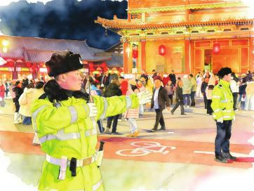 “警察叔叔,去古城西门怎么走?”“同志,现在鳌鱼花灯展开始了吗?”……19时30分,永泰门登城墙通道的游人越聚越多,咨询声此起彼伏。大同市公安局交管支队勤务保障大队古城中队负责人郝彩斌一边耐心解答游客的咨询,一边通过对讲机实时了解周边停车场车位情况。“今年车辆特别多,我们需要随时进行疏导。”