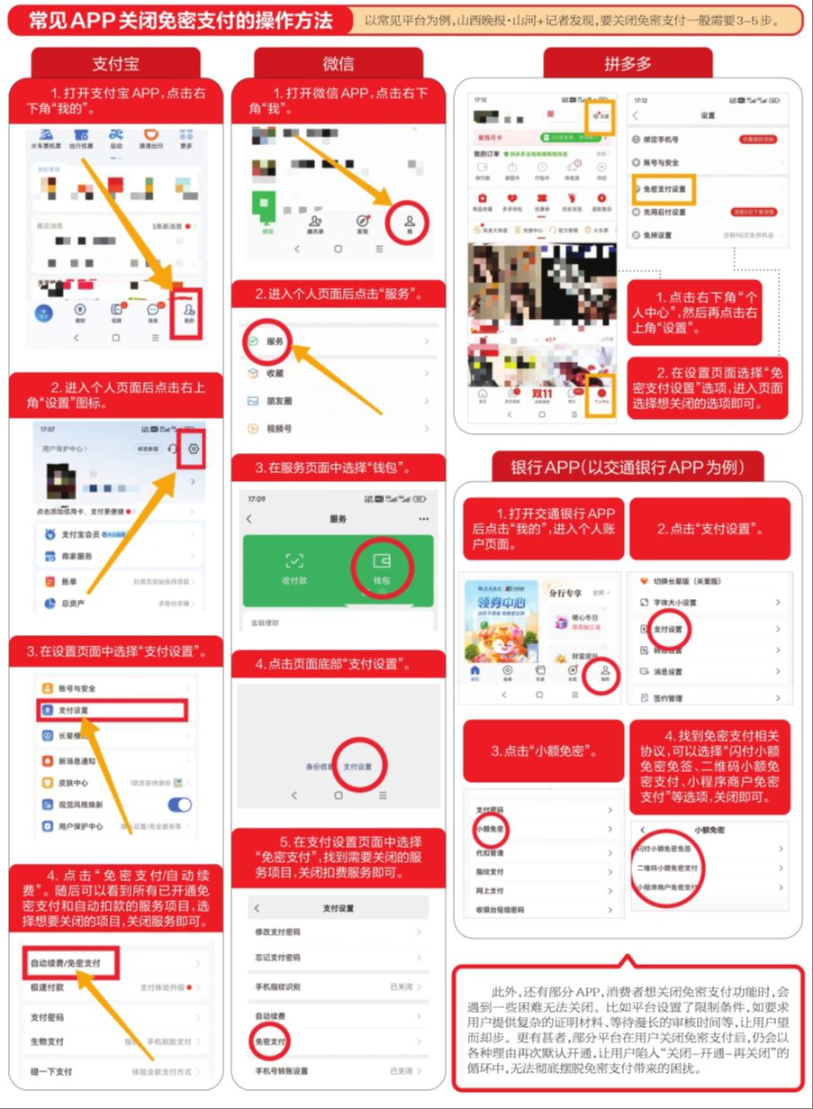 11月16日,太原消费者刘女士在早上6点起床就发现支付宝有一条被扣了36元的交易提醒信息,一查竟是某个早已弃用的会员自动扣费,这让她十分气愤。经过半个小时操作,她取消了这项网络交易签约,并成功要求把36元退回。她说:“许多人在使用各类APP或服务时,常陷入免密支付套路。尤其是一些视频平台以‘免费试用’作幌子,在用户点击领取福利时,默认勾选‘到期自动续费(免密支付)’,且未以显著方式提示续费金额和周期。用户免费服务期满后,银行卡便被自动扣款,自己却毫无察觉。”
