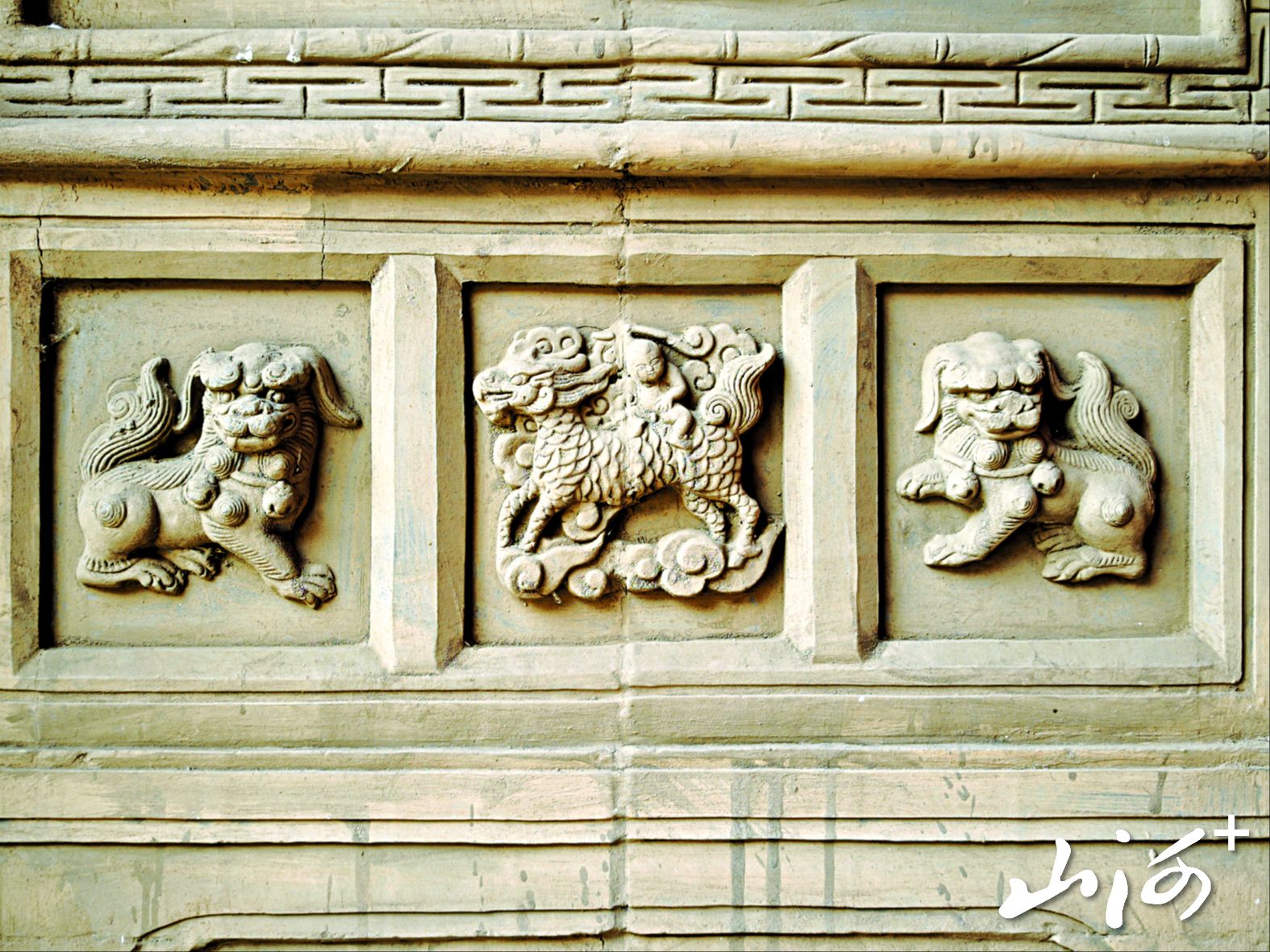 跨过高高的门槛,迎面是一座精美的砖雕影壁。正面刻着大象、佛手、寿桃、石榴、莲子,象征着富贵吉祥、多子多福。大门两侧的砖雕更见功夫:一边是“绶带贺寿”,藤蔓绕着绶带连起寿桃,另一边是“一路连科”,芦苇伴着白鹭,藏着家族对科举仕途的追求。