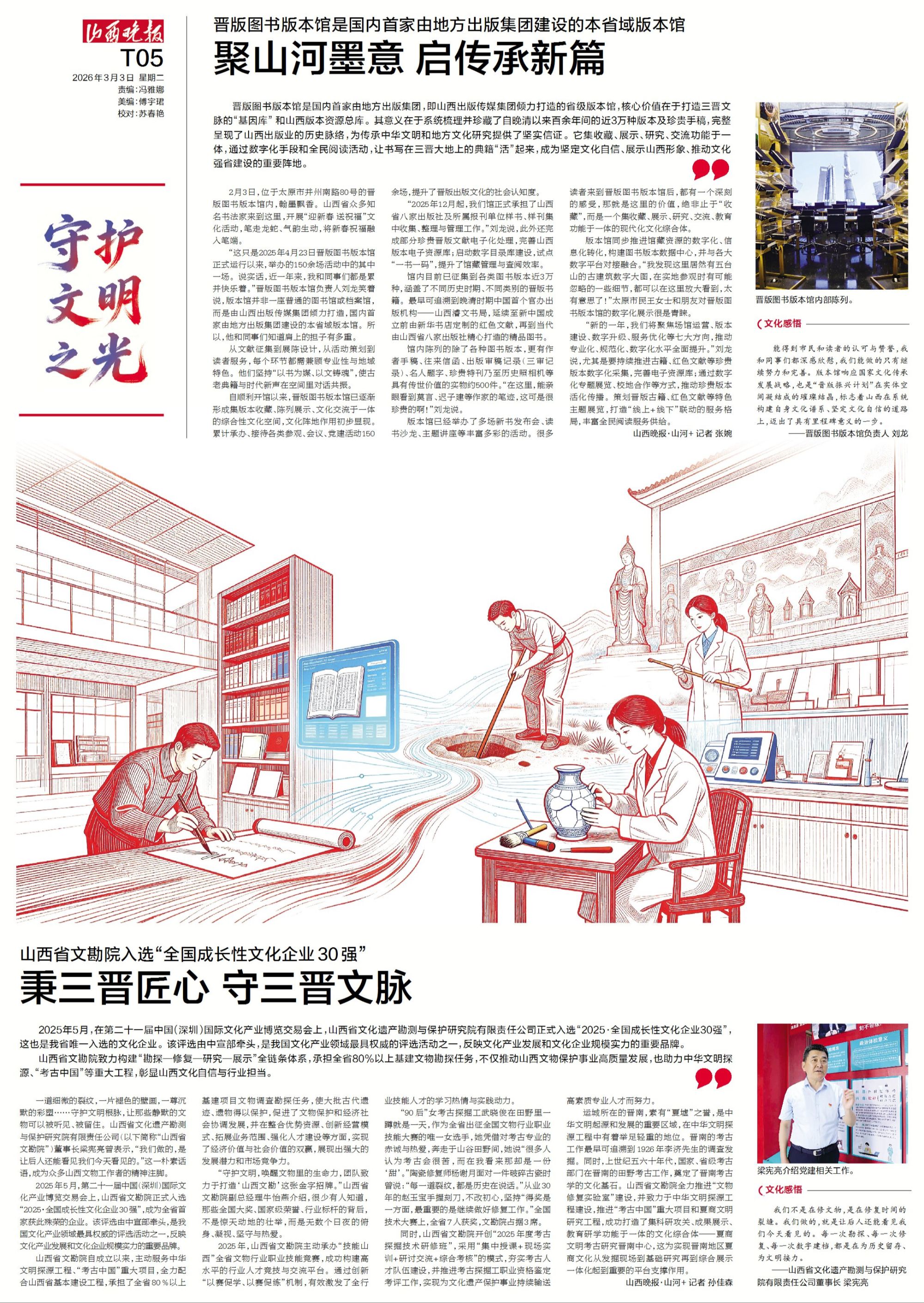 一道细微的裂纹,一片褪色的壁画,一尊沉默的彩塑……守护文明根脉,让那些静默的文物可以被听见、被留住。山西省文化遗产勘测与保护研究院有限责任公司(以下简称“山西省文勘院”)董事长梁宪亮曾表示,“我们做的,是让后人还能看见我们今天看见的。”这一朴素话语,成为众多山西文物工作者的精神注脚。