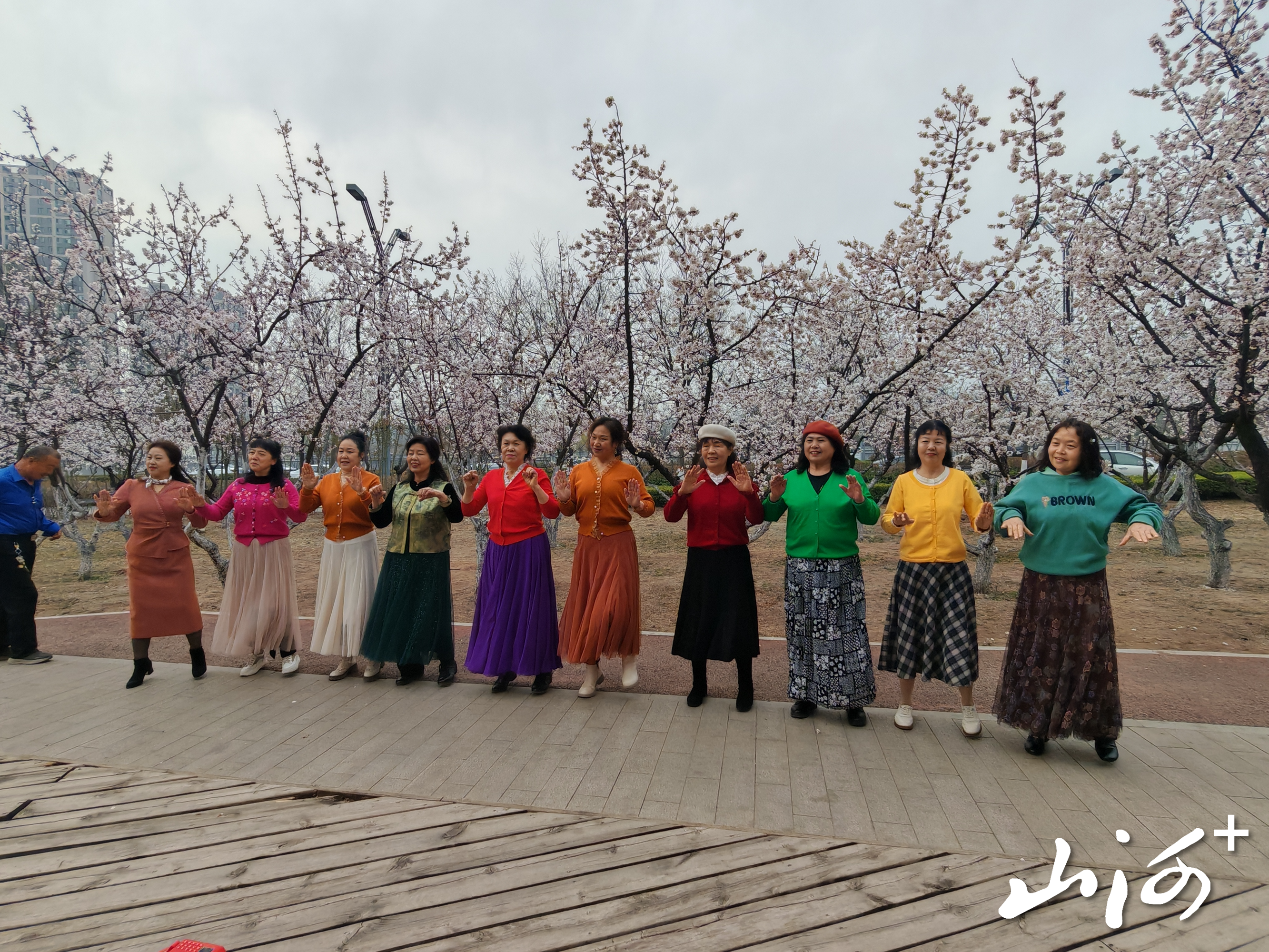 3月30日上午9时许,太原市万柏林区杏林园内,一树树桃花正热烈绽放,粉白相间,如云似霞。微风吹过,花瓣轻落,空气中弥漫着淡淡清香。在这片烂漫花海中,附近居民们或漫步赏花,或舒展筋骨。最引人注目的,是由居民自发组织的“呼啦圈舞蹈队”——10余位队员正一字排开,伴随着欢快的《聚会歌》节奏整齐旋转。记者在现场看到,她们步伐轻盈,舞姿优雅,脸上洋溢着灿烂的笑容。整齐划一的动作与身旁的灼灼桃花相映成趣,引得晨练的人们纷纷驻足喝彩。