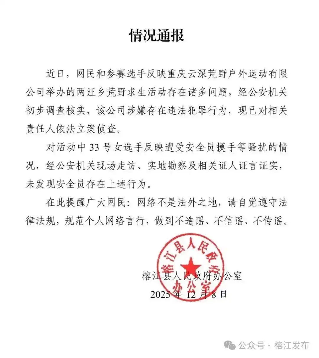 据微信公众号@榕江发布12月8日发布的情况通报,近日,网民及参赛选手反映该公司在两汪乡举办的“荒野求生赛”存在诸多问题。经公安机关初步调查核实,该公司涉嫌存在违法犯罪行为,现已对相关责任人依法立案侦查。
