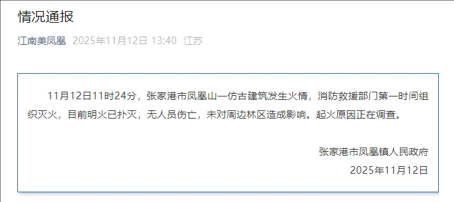 11月12日下午,山西晚报·山河+记者致电凤凰镇政府,一位工作人员表示,目前火情已被控制,没有伤亡,相关情况该镇政府已发情况通报。据情况通报,11月12日11时24分,张家港市凤凰山一仿古建筑发生火情,消防救援部门第一时间组织灭火,目前明火已扑灭,无人员伤亡,未对周边林区造成影响。起火原因正在调查。