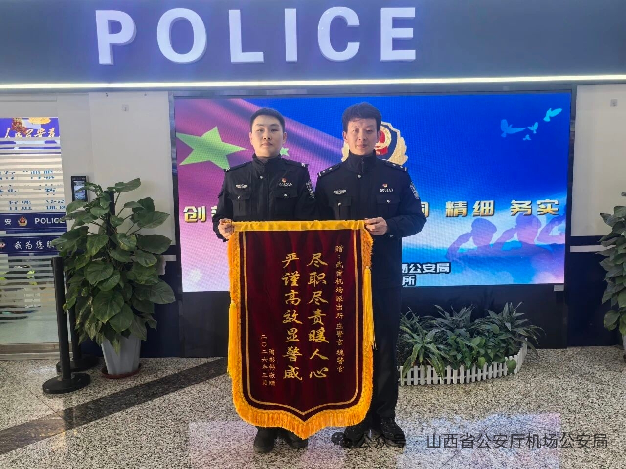 为表达谢意,刘先生委托家人寄来印有“尽职尽责暖人心,严谨高效显警威”的锦旗,并在厅官网留言,对机场公安热心为民、高效履职的优良作风表示由衷感谢。山西省公安厅机场公安局相关负责人表示,一面锦旗既是肯定更是动力,全局将继续坚持以人民为中心,在细微处践行初心,用心用情守护旅客平安出行。