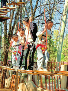 在太原森林公园内,家长、孩子一同体验“丛林穿越”项目。