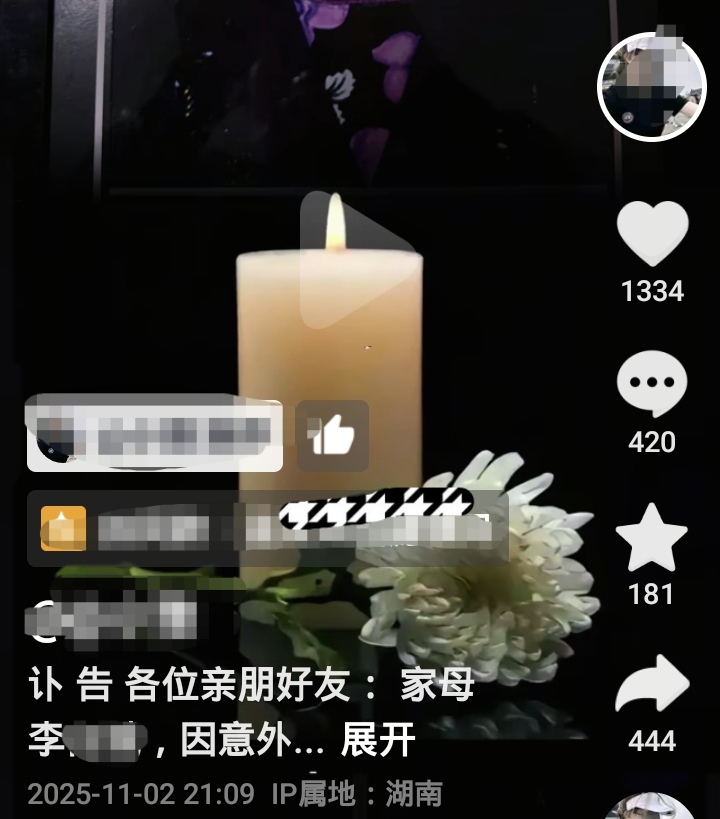 记者注意到,11月2日,李某某的儿子和女儿分别在个人社交媒体账号发布讣告:家母李某某,因意外伤亡,于2025年10月24日离开人世,享年53岁。家母为人忠厚善良,勤劳朴实,工作兢兢业业,对家庭尽职尽责,深受亲友尊敬。为表达对家母的深切悼念,兹定于11月5日在家中举行告别仪式,6日出殡,送家母最后一程。