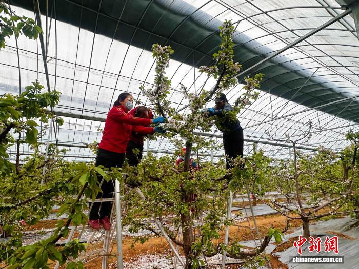 当前,西马村泽坤樱桃园内,千株樱桃树进入盛花期,满树繁花竞相绽放。工作人员穿梭其间,有条不紊地开展疏花、疏果、人工辅助授粉、温湿度调控等田间管理作业,保障樱桃树茁壮成长,为后期果品提质增效、丰产丰收夯实基础。