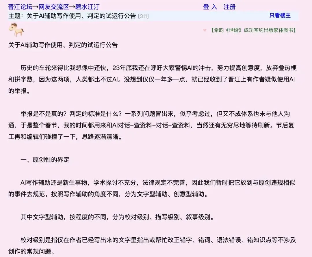 面对AI低质内容泛滥,多家网文平台已启动整治。番茄小说曾因在签约协议中加入“AI训练补充协议”引发争议;2025年2月17日,晋江文学城发布《关于AI辅助写作使用、判定的试行公告》,明确将AI辅助分为“文字型”与“创意性”两类,设定使用边界。一旦AI介入程度影响作品原创性,将禁止使用;违规者将面临锁章、永久禁榜等处罚。