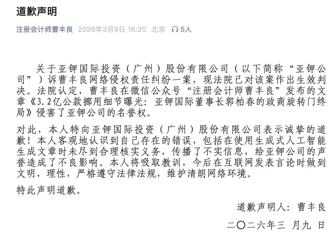 经查,曹某提供的原始材料无任何权威信源佐证,AI生成内容亦无合法出处。曹某辩称“内容系AI生成,非本人捏造”,不应担责。