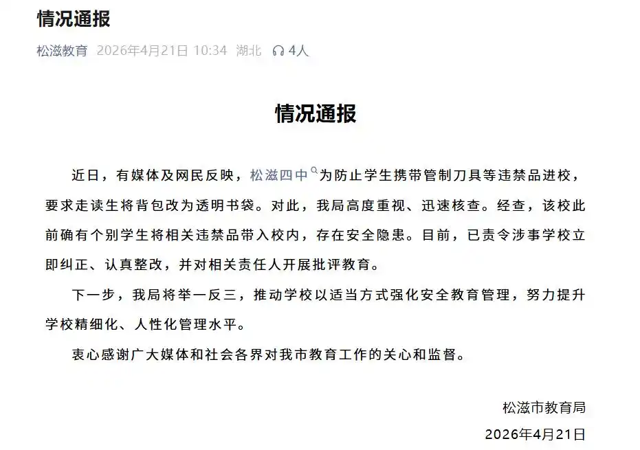 山西晚报·山河+记者检索发现,松滋四中此前曾发布通知称:“自即日起,所有走读生禁止背书包进入校园,请家长为孩子准备透明塑料袋,用于装当日学习用品。学校将于早晨在校门口检查,违规携带的书包将统一暂扣,贴标签注明班级和姓名,放学后方可领回。请各位家长提醒孩子配合学校管理,感谢您的理解与支持。”