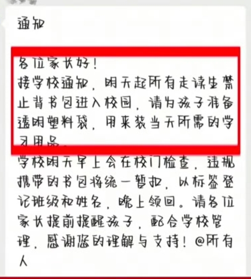 此事引发广泛争议。有网友指出,校园安全固然重要,但因个别学生携带违禁品,便要求全体走读生放弃使用书包,既不合理也不公平。这种“一刀切”的“透明化”管理,看似严格,实则治标不治本,甚至显得敷衍荒唐。