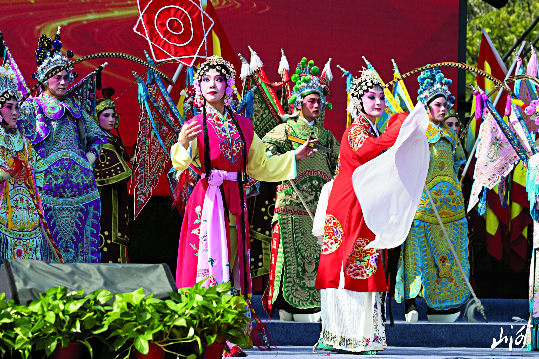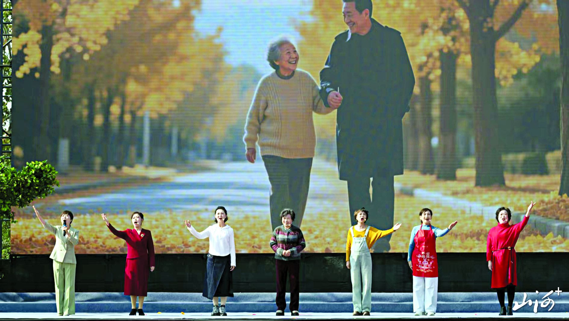 温情时刻定格在金婚致敬环节。25对金婚老人携手登台,主办方送上的“八仙祝寿”剪纸与嵌名对联,将非遗技艺与真挚祝福融为一体。中国戏曲“梅花奖”获得者孔向东领衔的《梨园颂德孝》唱响蒲剧经典,地方戏曲的醇厚韵味与德孝主题完美交融,将活动推向高潮。最终,全场合唱《歌唱祖国》为启动仪式画上圆满句号。