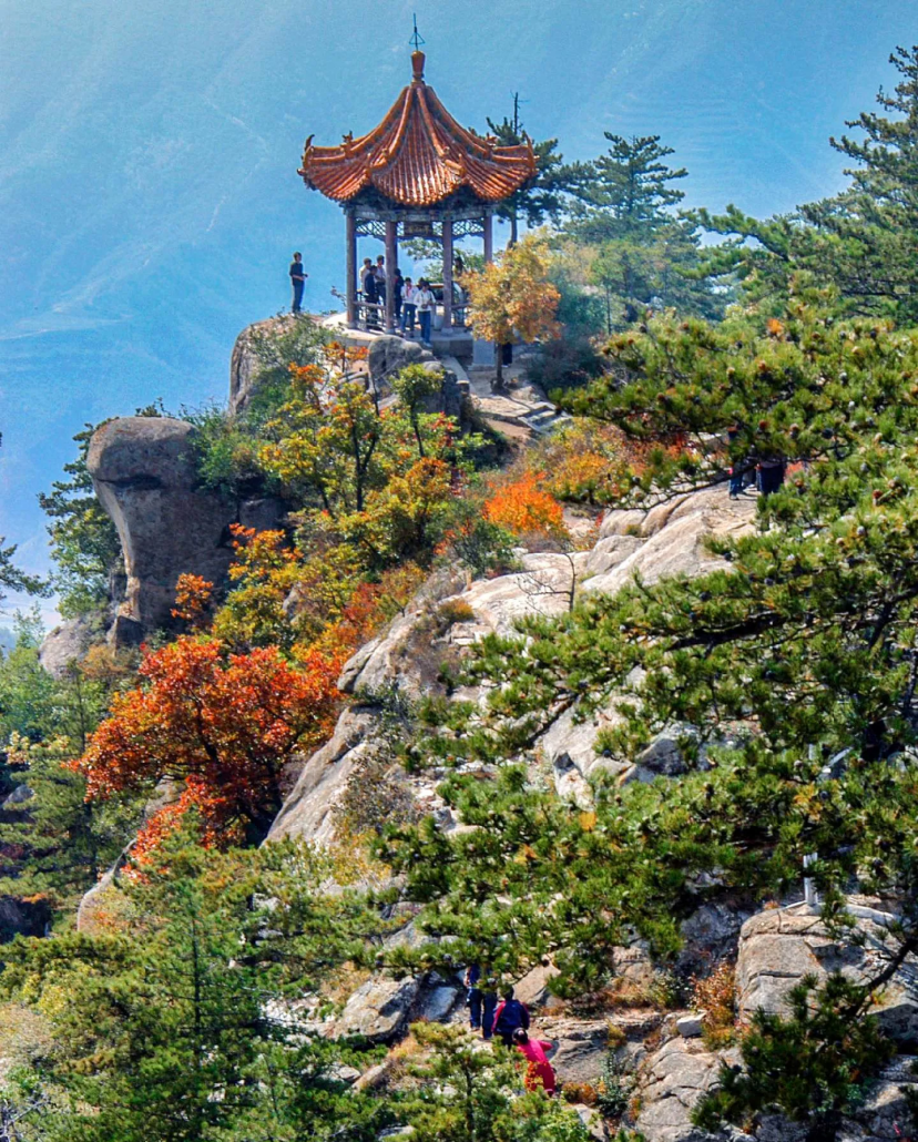 驱车驶入景区,青山相对,红黄相间的枫叶如云霞朵朵,台阶路两侧的松柏四季常青,景色如诗如画,指引着游人向山顶进发。