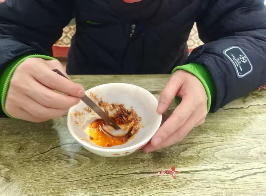 柳林碗托的一家店主向顾客演示最正宗的吃法:“加一些醋,还有碗团秘制辣椒加在里面。这个秘制辣椒香而不辣,陈醋又酸又香,然后在中间画一个圈,这是我们柳林人吃碗团的时候,最常见的一种食用方式,然后把中间这一块挑起来,这个味道美极了!”
